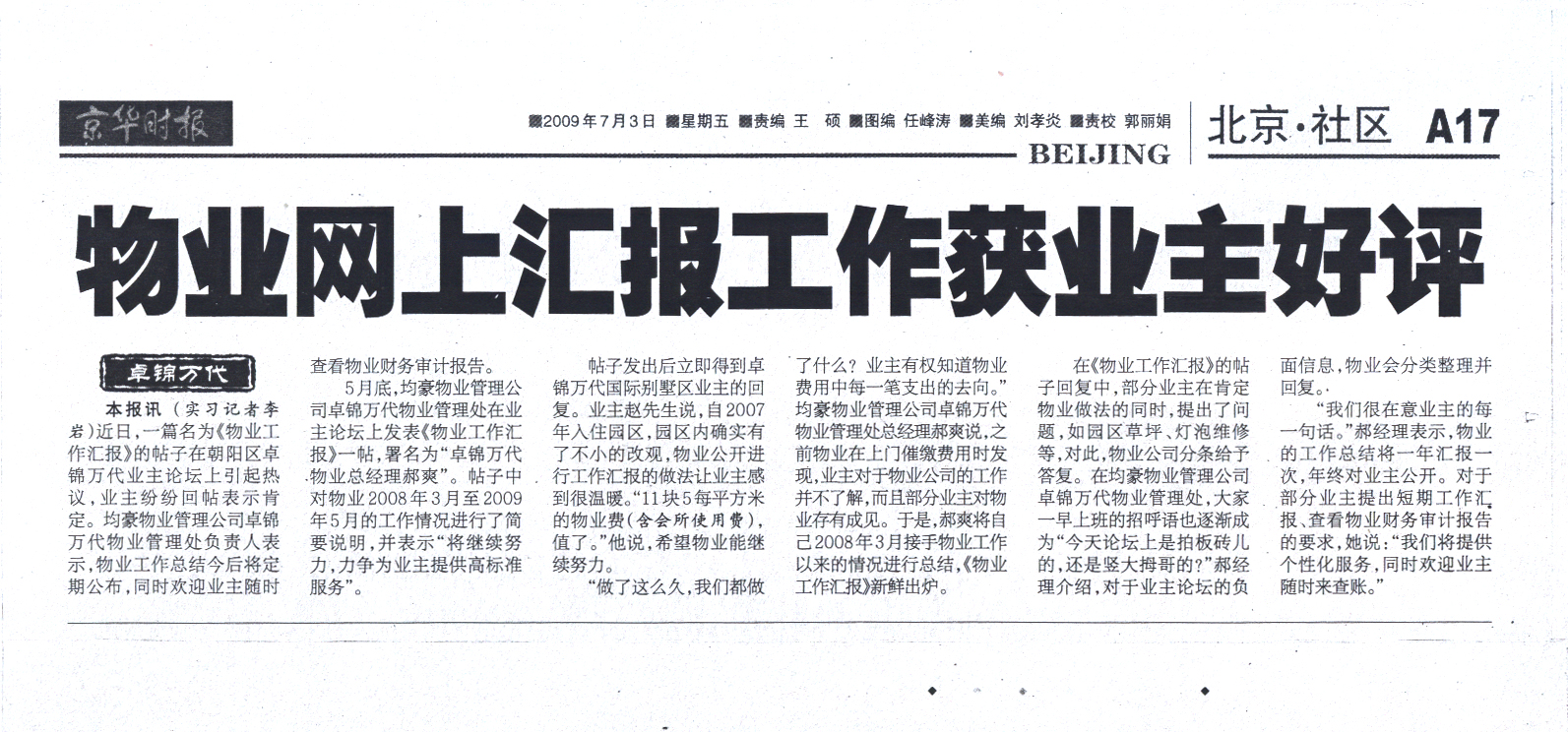 卓锦万代项目部的此次网上汇报工作引起了社会各界的广泛关注,《京华时报》新闻媒体纷纷对其进行报道,各方认为,物业公司这种开放的工作汇报方式,将有助于物业公司与业主进行广泛深入的交流,使业主对物业服务企业的工作有更好、更全面的认识,使双方有效避免因了解不全面导致的误解。开放的交流与监督,将促进物业服务企业服务质量的提高,并促进物业管理行业快速发展,成为阳光行业,真正通过服务提高业主与客户的生活、工作质量。