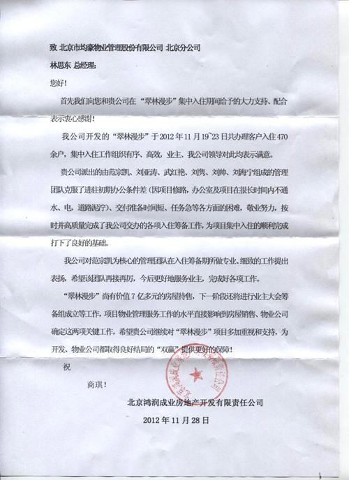 均豪企业规范的管理和人性化的周到服务得到了“翠林漫步”所属开发商的高度肯定和赞扬,在表扬信中,鸿润成业开发商对我们在“翠林漫步”项目办理入住过程中,均豪项目工作人员井然有序的工作秩序表示赞扬;对均豪项目管理者范宗凯、刘亚涛、武红艳、刘隽、刘帅、刘海宁以及其他同仁的倾心劳力、不辞辛苦的敬业和奉献精神予以嘉奖。表扬信虽然只有薄薄纸张,但代表着均豪企业在“翠林漫步”的专业品质得到了业主褒奖,更是对项目部严格要求,强化管理的最好回报,也为公司提升企业形象、树立优良品牌做出努力。