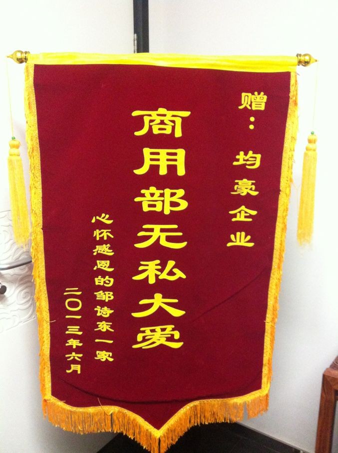 为表示对商用部的感谢,邹诗东一家特意制作了两面锦旗送给均豪北京商用分公司和澜茵山庄物业服务中心,邹诗东的母亲说:“孩子遭遇意外是不幸的,但是碰上均豪这样的好公司以及公司的好领导又是万幸的。太多的感谢我们无法用言语表达,只能用两面小小的锦旗,表达全家的感激之情,大家的恩情我会牢记在心,感谢所有好心人!”目前,邹诗东精神状况良好,他非常感谢大家对自己的关心和帮助。祝愿他早日康复,回到他热爱的工作岗位,继续为公司奉献自己的光和热。