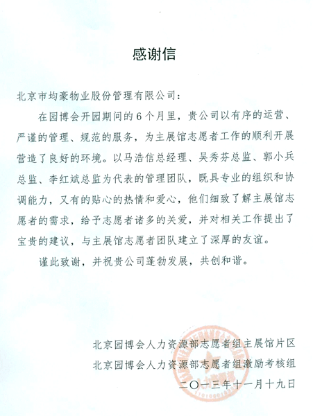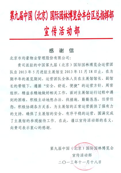 完美亮相,圆满收场。2013年11月18日,随着第九届中国(北京)国际园林博览会正式闭幕,均豪园博园项目组光荣完成了本届园博会的管理顾问及场馆运营任务。