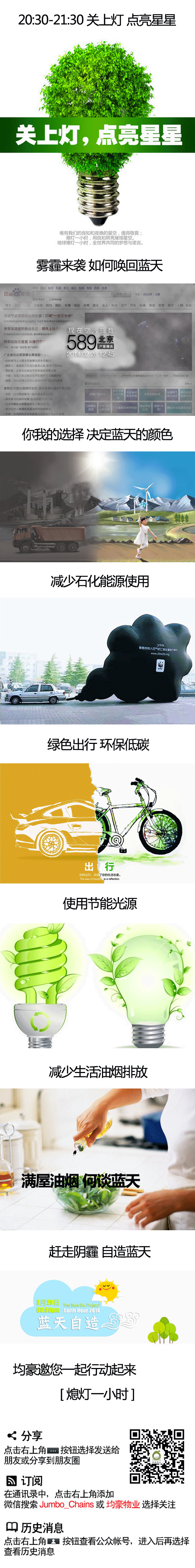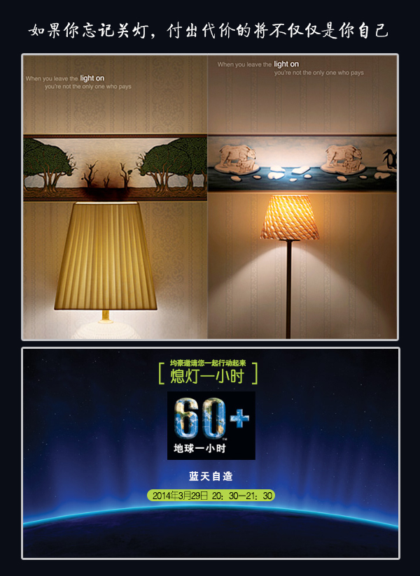 2014年是地球一小时来到中国的第六年。今年的地球一小时以“蓝天自造”为主题,号召更多人关注空气污染,推动解决方案,应对雾霾,找回蓝天。雾霾治理是一场攻坚战和持久战,蓝天不会自下个月起就不再离开,需要我们每一个人有决心、耐心和信心,留住蓝天。