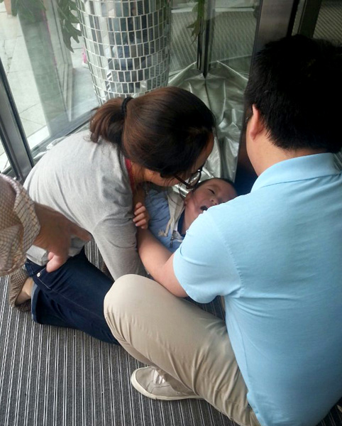 现场情况非常紧急,而围观人员较多,小孩卡在转门下的脚已有青紫迹象,如果处理不及时很可能留下残疾,孩子的父母在一旁心急如焚却手足无措。在如此混乱的状况下,张颖安排保安员维持现场秩序,将无关人员疏散清场,给工程部的同事腾出操作空间。客服部王珂负责安抚孩子的父母,劝阻他们停止拉拽小孩的脚。值班经理李松进行拍照取证(详见照片),一旁的工程部肖飞、夏荣斌和雍茂文用撬棍从转门边缘慢慢撬起转门并一点一点向小孩的脚下推进,为了防止转门钢化玻璃碎裂对小孩造成二次伤害,值班经理和工程部几位师傅手脚并用,在不损坏转门的情况下将孩子顺利救出,前后用时不到5分钟。