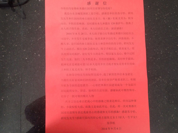 事后,从伤者家人处了解到,事发前,伤者正骑自行车去往公司,途径奥都庄园时不幸遭遇交通事故,重重地摔下车,随即倒地昏迷。当时的情况十分紧急,伤者已经颅内出血,幸得均豪的两名员工挺身而出,不怕为自己招惹麻烦,及时叫来救护车,才未造成生命危险。为了当面答谢见义勇为的好心人,伤者家属多方寻找、打听,得知救人者是均豪物业奥都庄园项目部员工,多次要求重金酬谢,都被项目负责人婉言谢绝,令伤者家属深受感动。