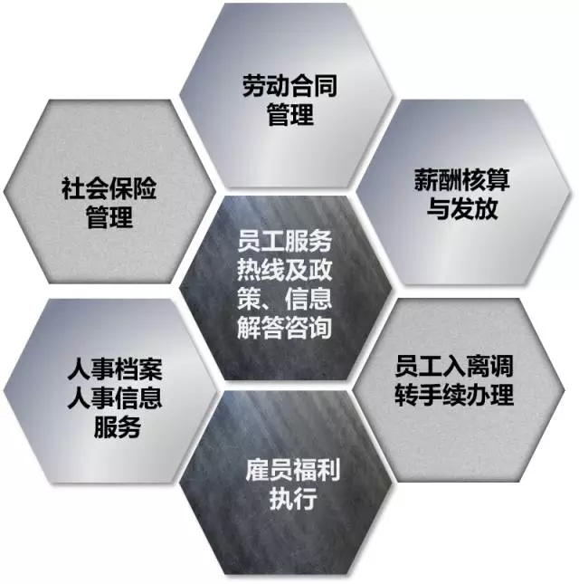 •降低运营成本,提高人力资源的运作效率,更好的服务业务单元。•总部的人力资源部门可专注于战略性人力资源管理的实施,使人力资源管理实现战略转型。在HRSSC成立初期对集团内部提供人事服务,主要的业务范围涵盖以下七方面