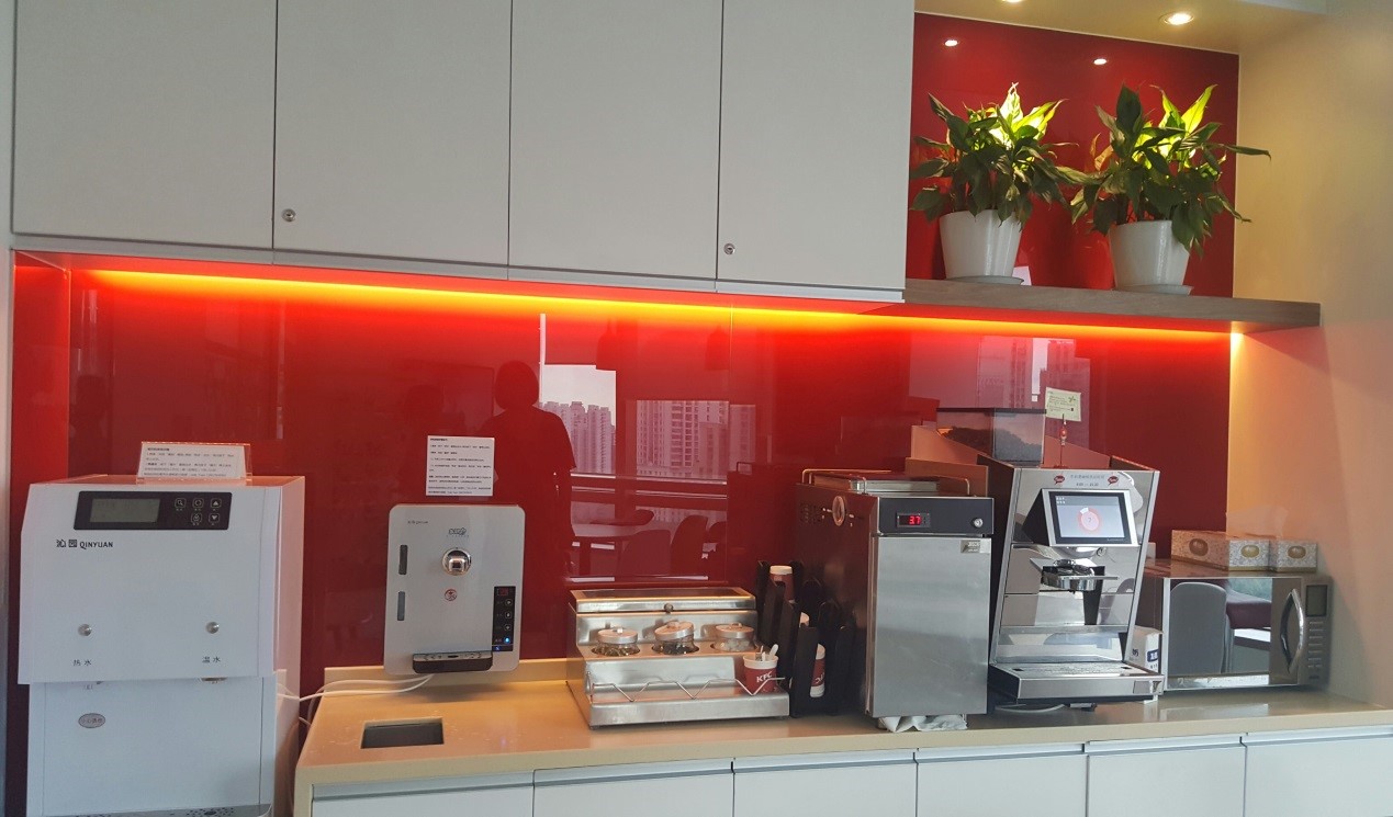 如下图所示,水第一步进水过滤是必需,第二步你可选择,100度的快速直开水(出水速度较慢,但绝对100度),第三步有冷热皆宜的直饮水机。而那台8万元(租赁形式)的咖啡机也是每层茶水间的必备。