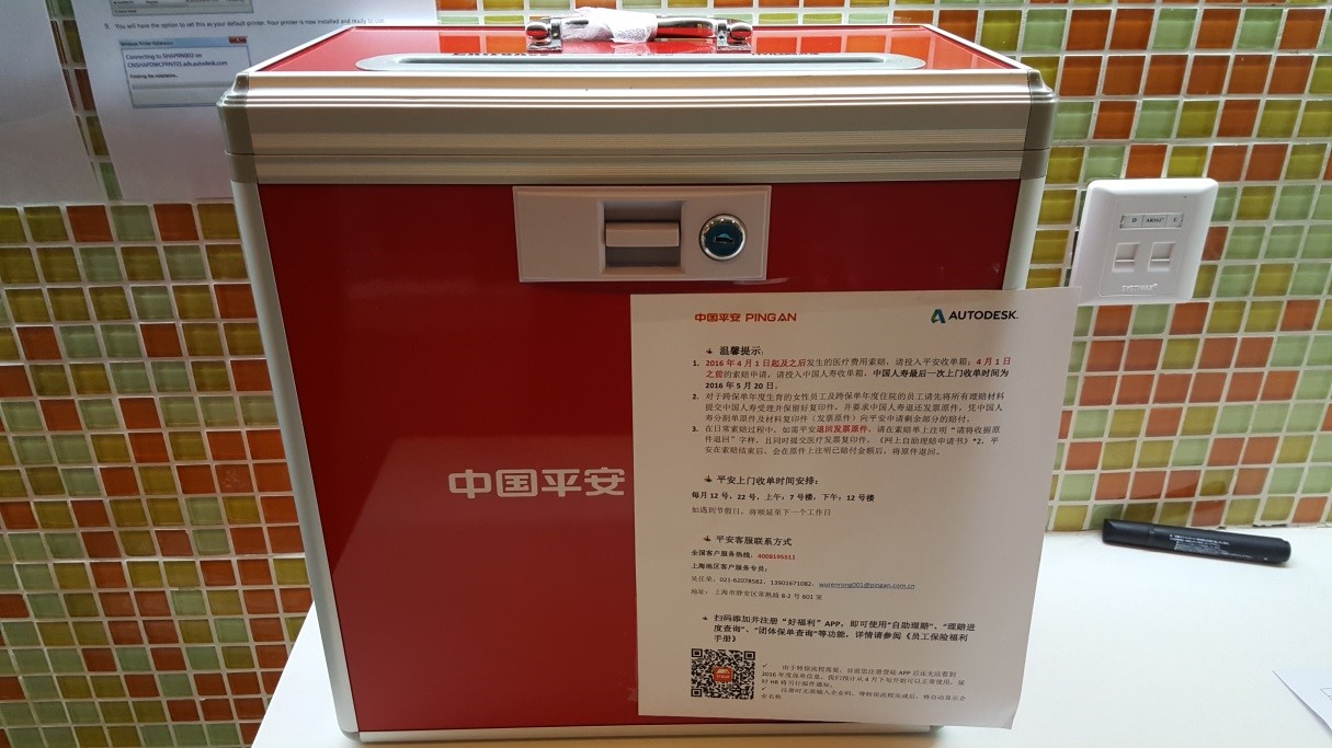 3.、除了牛奶、咖啡、茶、水果糕点、药箱外,还有暖心福利-商业医疗保险(如图所示),只需将医疗发标投入收集箱即可解决医疗费用的报销问题。