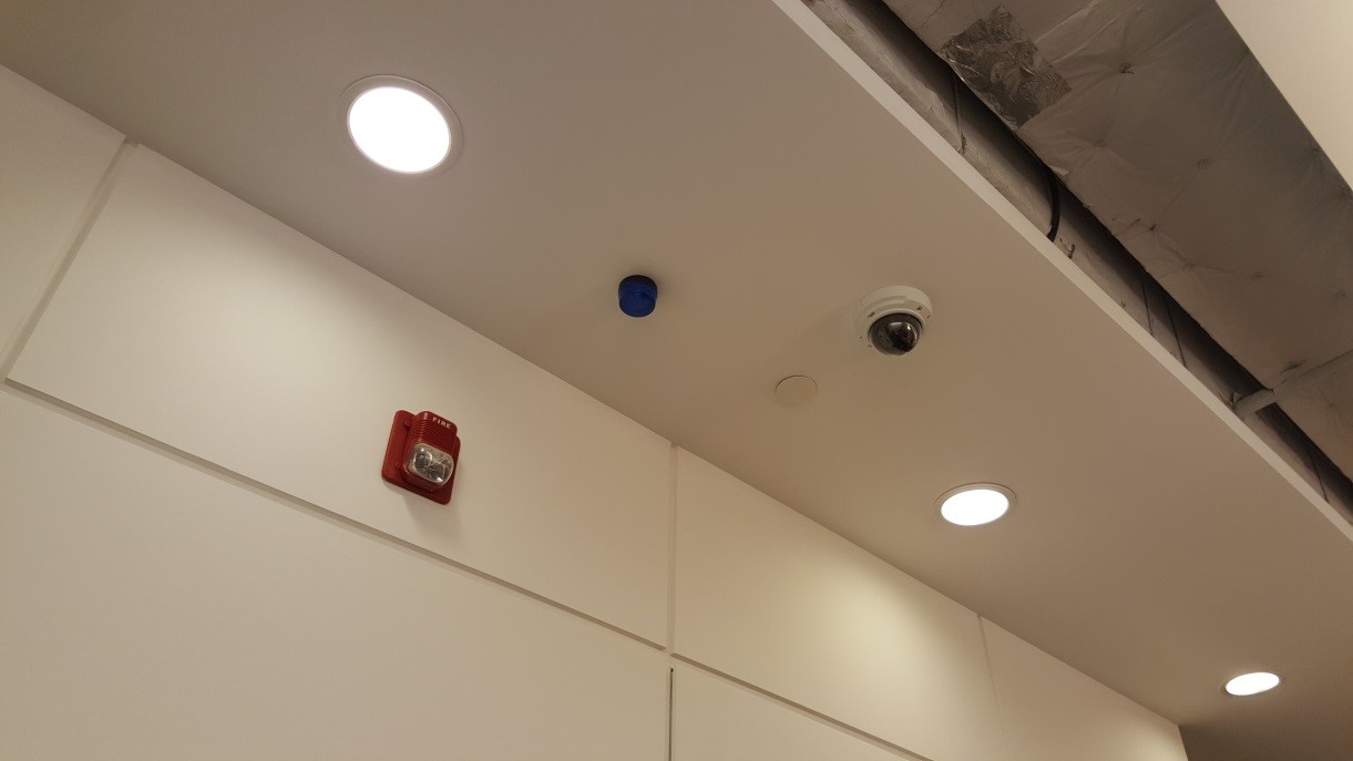 2. 我在AUTODESK公司每层的办公区域内,发现如下图所示的一个蓝色灯装置,原来,这是与前台相联的一个报警灯,若前台遇警,则会按动报警,蓝灯闪烁,让每个办公人员都知晓有紧急情况发生。