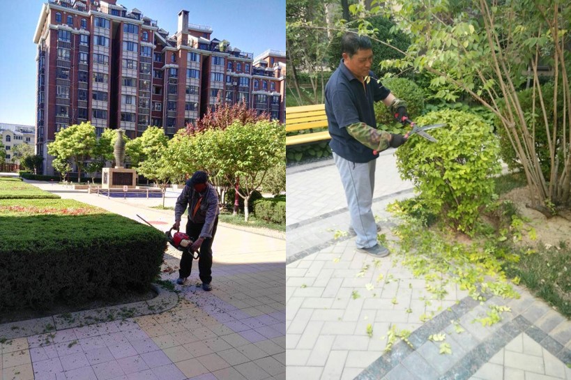 整齐的灌木,茂密的草地,颜色和谐搭配的花卉背后的维护、改造工作进行的快速而有效率。