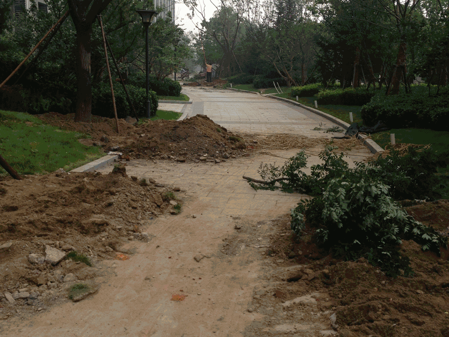垃圾堆积,地皮裸露,锈迹斑斑,本来秀美的小区,由于施工区域与已入住区域交叉,已入住区域反复施工,给日常的物业服务造成极大的困难和不便。