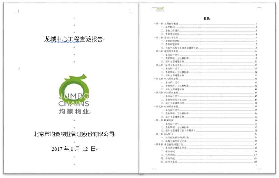 承接查验工作结束后,当北京昌平科技园发展有限公司的管理团队细细阅读了174页的查验报告后,对均豪专业化、规范化的工作流程和结果十分认可,并希望可以继续应用均豪在商业资产管理上的先进设施设备管理技术,于是,双方达成共识,由均豪负责龙域项目后期的物业运营工作。