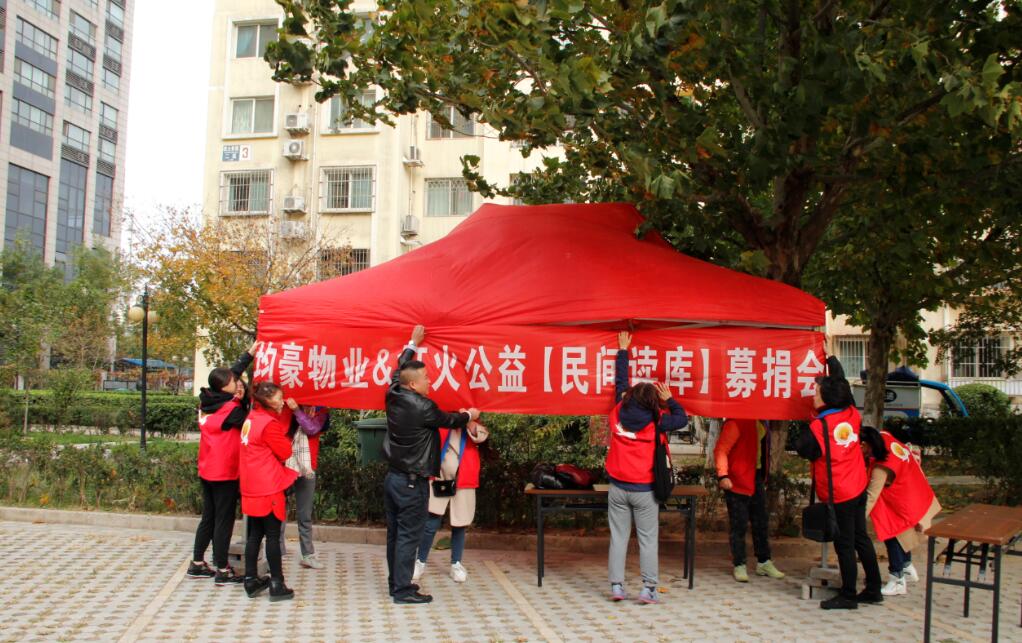 2017年10月28日,大风吹走了连日的雾霾,北京迎来初冬最寒冷的一天。在均豪在管的北京世纪景园社区里,一群红衣人大清早就开始忙碌,他们是来自均豪集团不同部门、不同项目部的员工,红色的志愿者服让他们从兢兢业业的物业职业人变身为灯火公益【民间读库】的召集者。