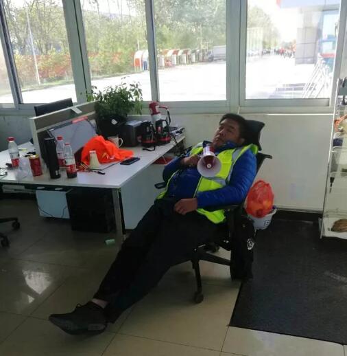 2017年11月13日,天津菜鸟物流园的物业办公室里,项目经理沙德腾终于累的瘫坐在椅子上睡着了,执勤的“小喇叭”还握在手中。为了应援双11物流高峰,他已连续3天每天24小时执勤,同事不忍叫醒他,用手机记录了这一动人时刻。
