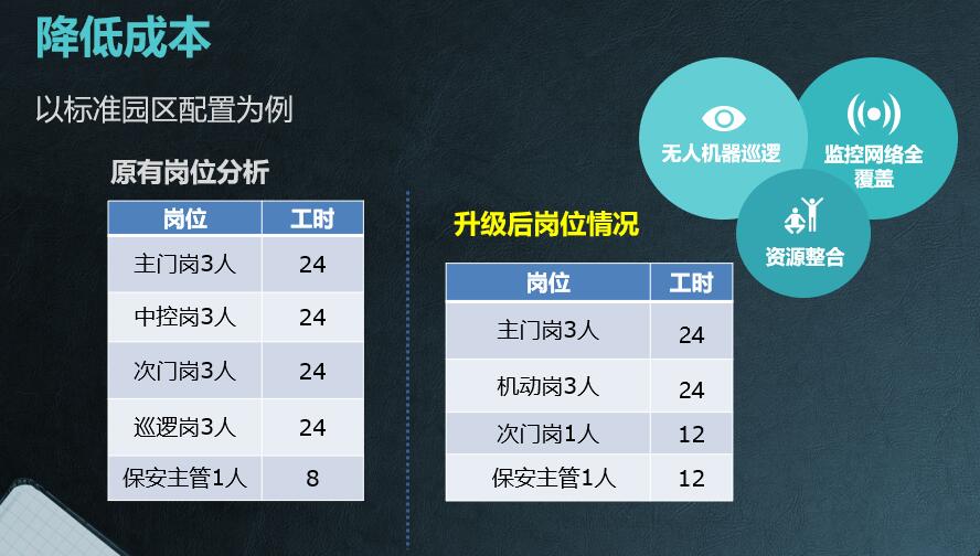 主门岗闲时由指挥中心值守、中控岗和巡逻岗合并,次门岗通过自动识别、视频联动监控可减少至1人值守,因为人均管理面积的扩大,所有岗位缩编至8人,成本节约15%。