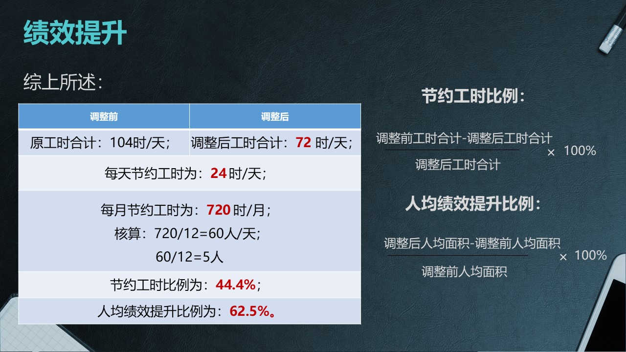 在成本降低的同时,人均绩效也得到相应的高幅增长,节约工时比例达44.4%;升级后人均绩效提升62.5%。