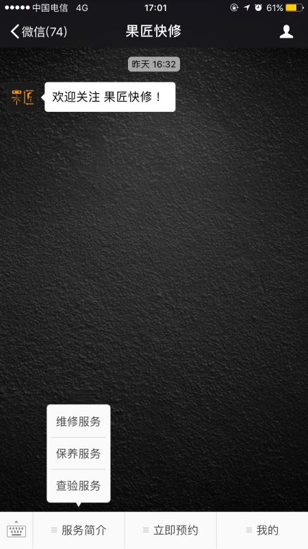“滴滴”,让出行更美好;“美团”,让用餐更方便;“果匠”,要让维修更简单。在“果匠快修”公众号上已经上线了一键报修的功能,选择要维修的设备,上面有明确的价格,留下联系方式与地址,就会有师傅联系上门维修,修理完成后即可用手机支付。如果是已合作企业,核心设备设施都贴有专属二维码,只需要微信扫一扫二维码即可一键报修,同时手机工单与工程进度是同步的,施工到了哪一步骤一目了然。