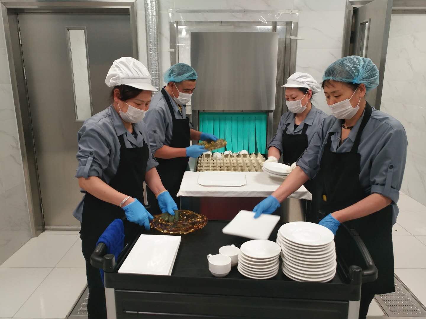 管事人员对会议现场5000多件杯子、上万酒具和餐盘等用具进行清洁、消毒、替换,随时根据会场需求进行撤餐管理。由于峰会的重要性,所有均豪团队需驻扎峰会48小时,大家严阵以待,不眠不休,全力保障峰会圆满进行。峰会的圆满进行离不开所有青岛公用人夜以继日的劳作和无怨无悔的付出。同时均豪旗下专业设备维修公司——北京铭泰设备维修有限公司在峰会筹备初期给予的大力支持,充分展现了均豪本一家的团队精神。