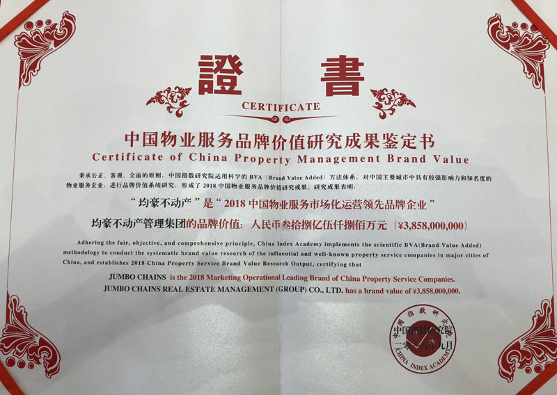 由中国指数研究院主办的“中国物业服务品牌价值研究”,自2010年以来,已连续开展八年,研究成果引起了社会各界的广泛关注,对品牌企业提升品牌形象、沉淀品牌资产、强化行业地位发挥了重要作用。均豪不动产以其优异的市场表现荣获“2018中国物业服务市场化运营领先品牌企业”荣誉,品牌价值38.58亿,环比增长57%,彰显了企业品牌实力与价值。