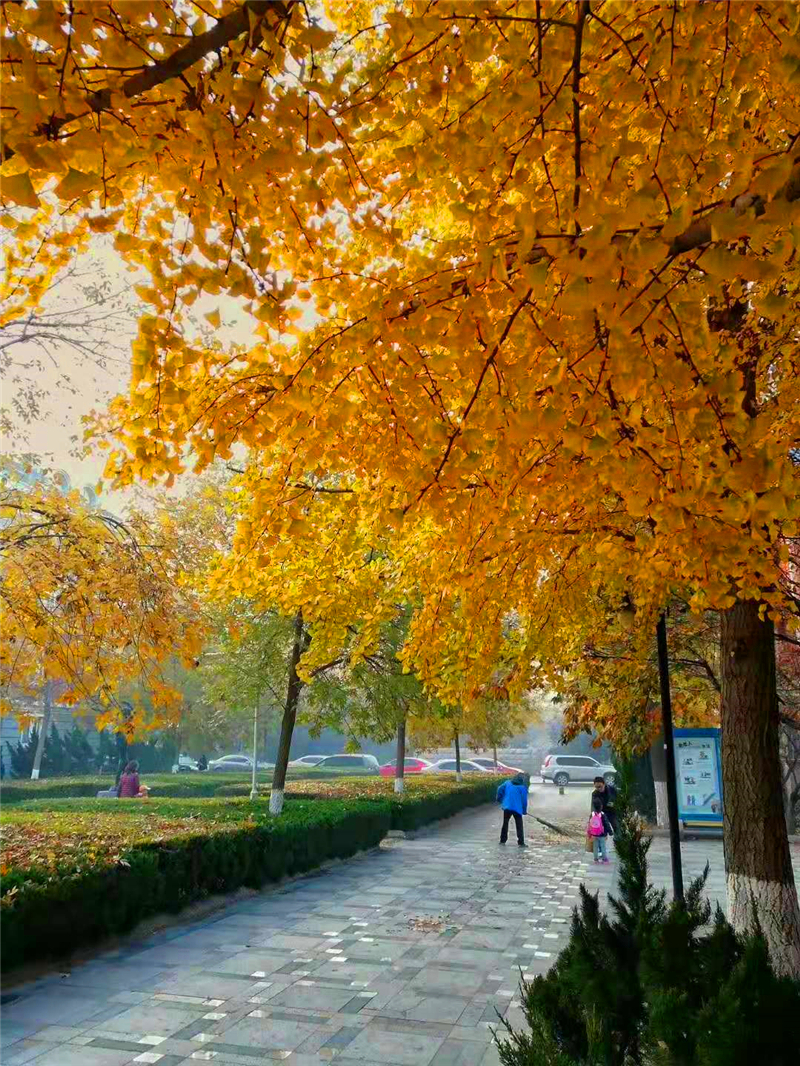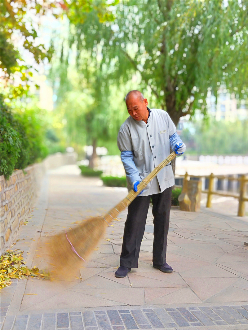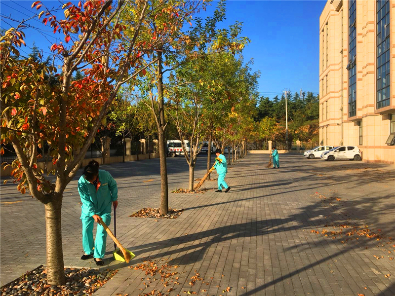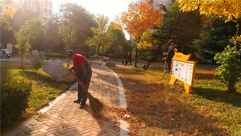 烟台慧园西区的保洁员正在清扫落叶