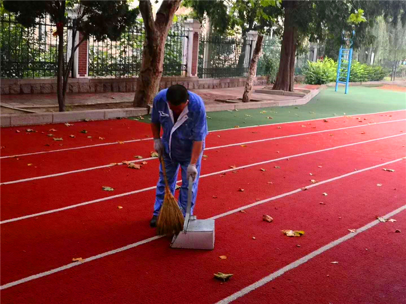 青岛三中的保洁员正在清理操场、跑道