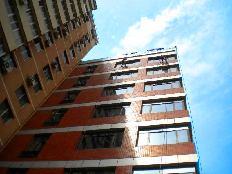 新洲大厦工作人员清理外墙,加装防护条