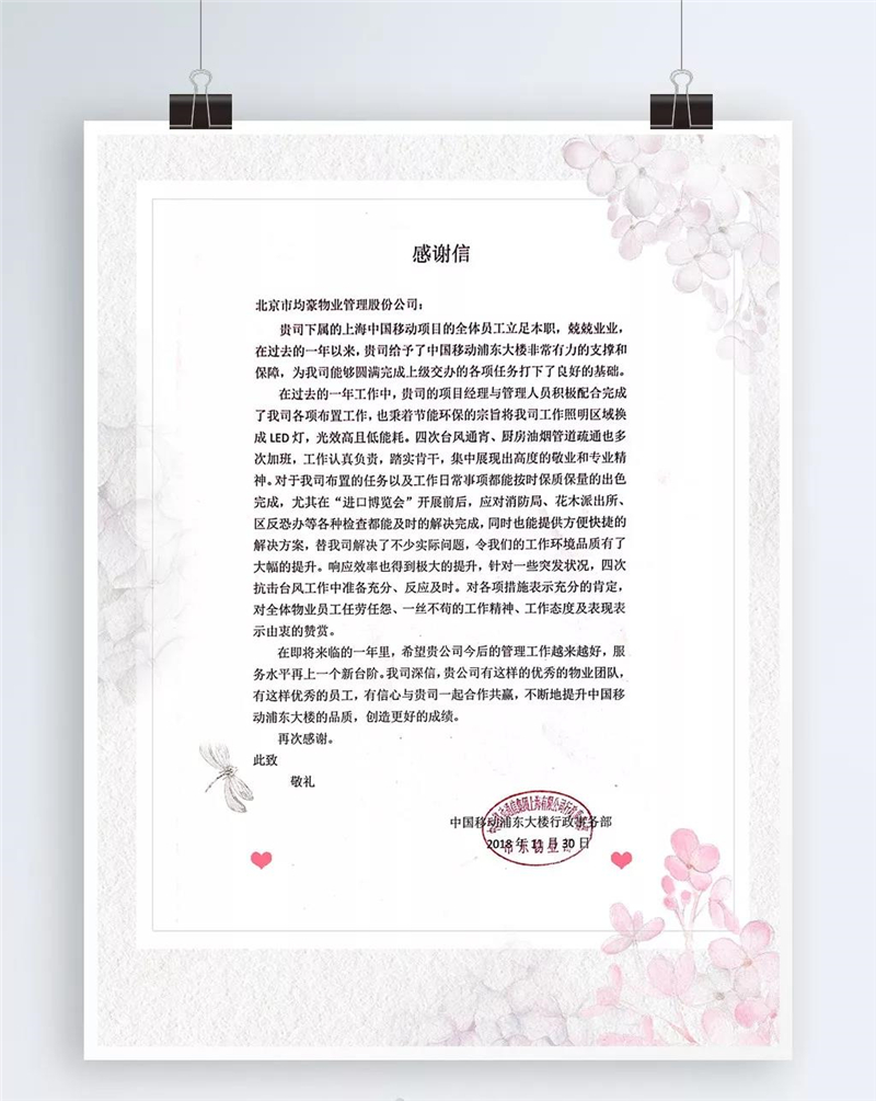 2018年11月30日,均豪不动产收到了一封来自上海中国移动客户的表扬信。