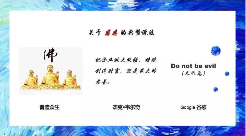 每年这个时候,我都会做一个和企业文化相关的演讲,今天演讲的主题叫《慈悲》,今年年会的片头,讲述了一段小故事,这个故事的结论是,这个世界没那么好,但也没那么糟,之所以没那么好,因为世界就是这个样子,之所以没那么糟,是因为这世界有一份善良在里头。“慈悲”是个大词儿,佛经上讲“大慈”就是给众生以快乐,帮助人家脱离苦,就是悲。以苦得乐称为“慈悲”。民间的词叫“善良”,我们把慈悲和善良再换一个词,叫做良知。何为良知呢?不教而知,谓之良知。