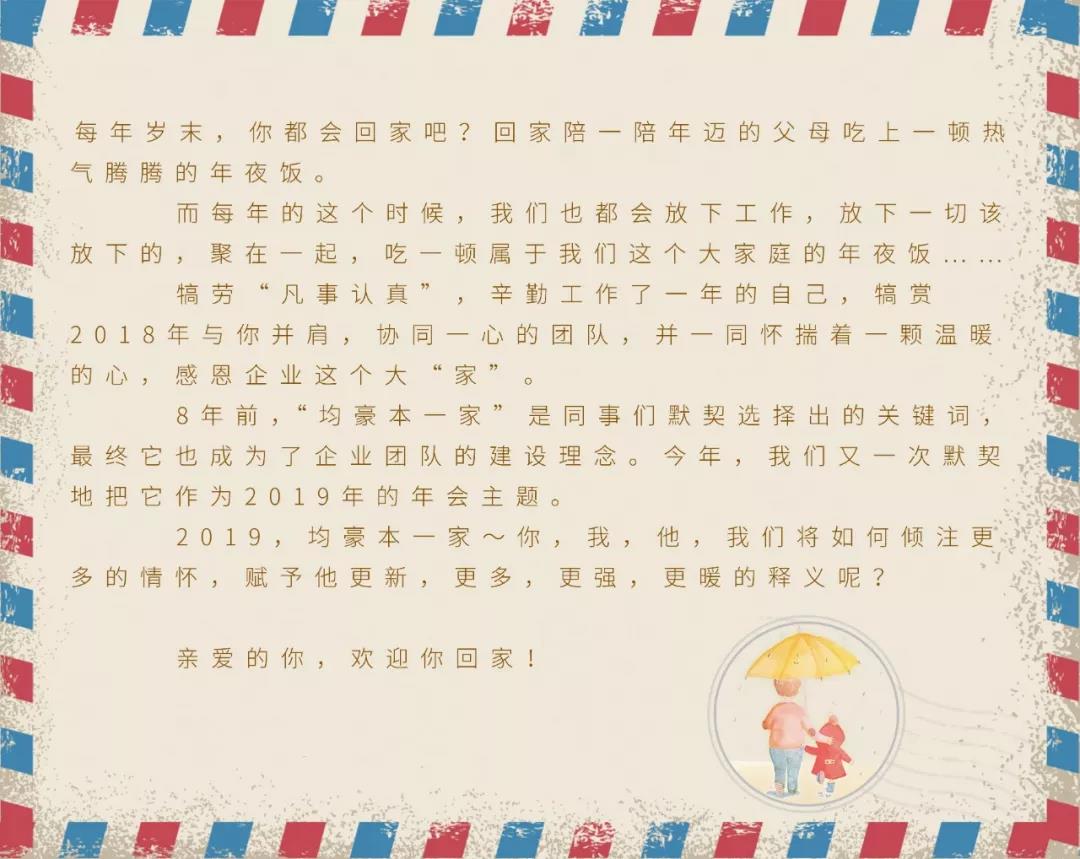 2019年度年会结束了。和家人们牵手走过了又一个春秋。2018年,我们脚踏实地,迎来了集团的成立;我们立足专业获得市场尊重,喜提行业殊荣;我们凡事认真;我们调整前进的步伐,提高专业标准。从资产管理的角度认识施设管理,提出FM+的创新理念;2018年,我们聚焦不动产管理人才培养,发挥集成的力量。和家人在一起的地方就是温暖的家,这里有我们的兄弟姐妹,这里有我们一起成长的足迹。和家人彼此相亲相爱,我们凝聚在一起。今天我们在一起,明天我们在一起,均豪本一家,我们永远是一家人!