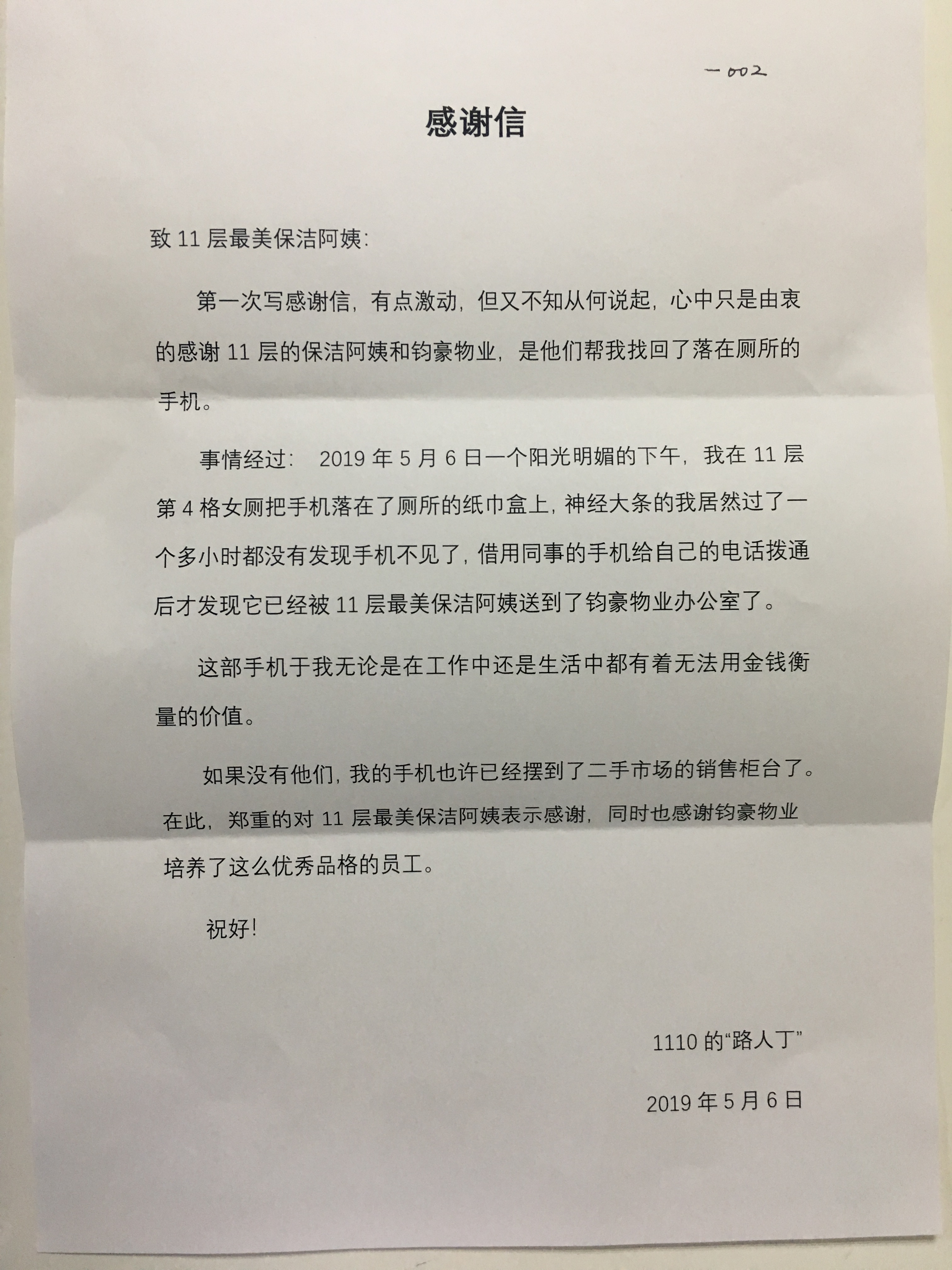 5月6日,商用楼宇设施分公司龙域中心项目部收到一封感谢信,署名是1110的“路人丁”。