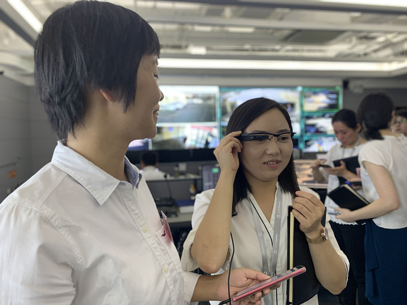 随后,一行人回到均豪集团总部,参观了总部下沉广场的集控中心。技术中心IT 工程师罗欣为大家生动讲解了技术中心的职能目标、工程组织系统及业务模型、工程业务管理模式、行政秩序管理和安全体系规划建设。最后,他还特别向大家介绍技术中心重要业务创新模式和新产品,可穿戴式设备—AR眼镜 GLXSS ME ,此款可穿戴式设备结合配套的系统平台,可以通过第一视角交互,实现多维度的连接、认知与协同,可胜任保安、保洁、医疗、工程维修等多处工作场景。