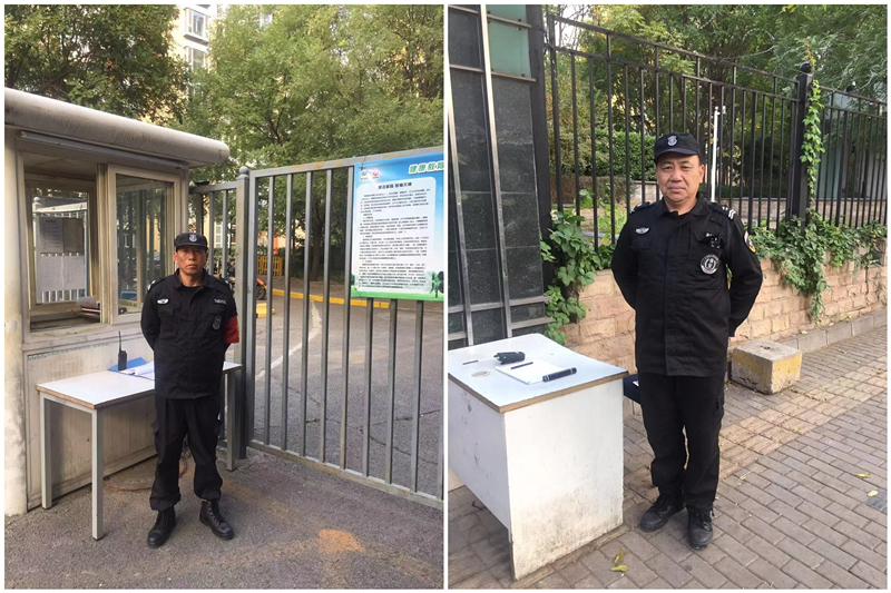两位保安员一个叫柴广金,一个叫张洪海。老柴今年51岁,去年7月份入职均豪宝星园项目保安队,现任大西门保安员。老张今年49岁,今年8月刚刚入职均豪宝星园项目保安队,现任小西门保安员。