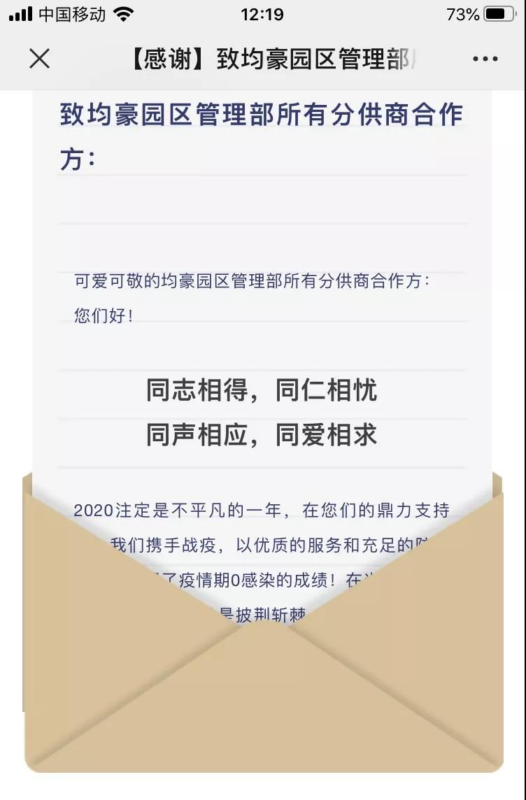 当物资紧缺,分供商第一时间多方筹措,立即送达。他们用实际行动做到了“守土有责、守土负责、守土尽责”。在广大分供商合作伙伴的鼎力支持下,双方携手战疫,以优质的服务和专业的防疫战略,取得了疫情期0感染的成绩!为此,均豪园区在2月7日向广大分工商合作伙伴发出了《致均豪园区管理部所有分供商合作方的一封信》,感谢他们在关键时刻为防疫工作所做的突出贡献。