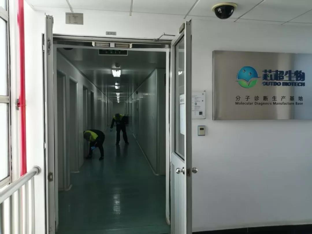 大疫当前,消杀是关键。项目部保洁人员返岗后,立即开始了大面积消杀工作。园区内部地面,用稀释后84消毒药水拖地,不锈钢及铁器部位用75%酒精擦拭消毒。为防止交叉感染,我们还特别划分了消杀重要区域,分别为门岗进口摆闸、道闸设备,垃圾房,卫生间,厨房,玻璃连廊,电梯轿厢,大厅前后等。其中,电梯和卫生间属于重点部位,每两小时就要消杀一次,其他部位每日两次。另外,芯超生物车间外围专人负责,做重点清扫消毒。工程保障方面,根据方案要求定期开启空调除湿机组,提供臭氧杀菌。