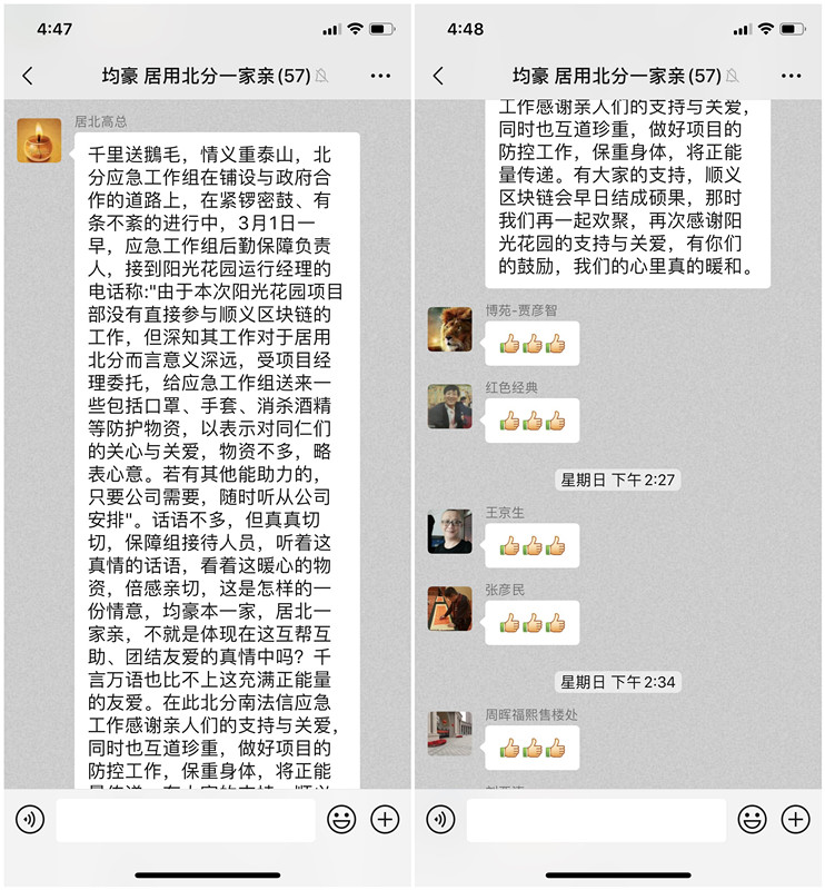 据了解,南法信防疫管控支援服务已被居用北分列为公司三年发展规划的重要组成部分。政企合作已经在顺义区后沙峪、南法信等多个项目落地、生根、开花、结果。居用北分就是要举全公司之力,在顺义区率先打造一个不动产管理领域的区块链模型。发展靠创新,实践靠全员,成果交给政府、业主去检验。温暖团结的均豪人,用实干担起责任,用行动履行诺言,用专业铸就品牌,相信南法信防疫管控支援服务这一仗一定打得漂亮,赢得漂亮!