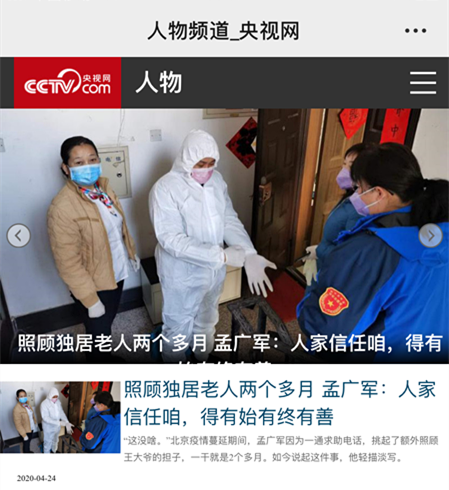 【编者按】今天,央视网人物频道以题为《照顾独居老人两个多月 孟广军:人家信任咱,得有始有终有善》报道了,北京均豪物业青岛嘉园项目运营经理孟广军在疫情期间,义务帮助社区老人王大爷的事迹。两个多月的时间,孟广军既要忙本职工作,又要照顾年迈生病的王大爷。他是青岛嘉园社区兼职副书记,更是身扛责任与担当的均豪物业人。