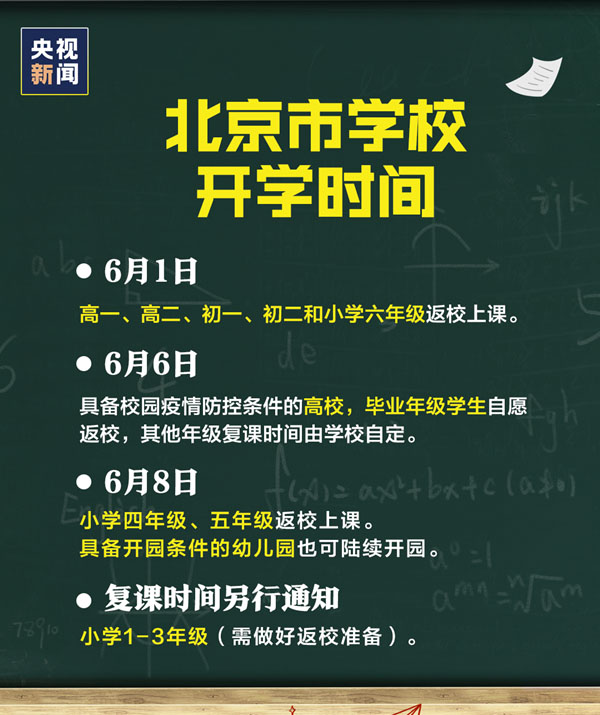 在5月13日举行的北京市新冠肺炎疫情防控工作新闻发布会上,北京市教委新闻发言人表示:将启动北京市各级各类学校返校复课工作。其中,普通中小学各年级返校安排为:6月1日起,全市普通中学高一、高二年级,初一、初二年级和小学六年级返校上课。6月8日起,小学四年级、五年级返校上课,一至三年级同步做好返校准备,具体返校时间视情况另行通知。