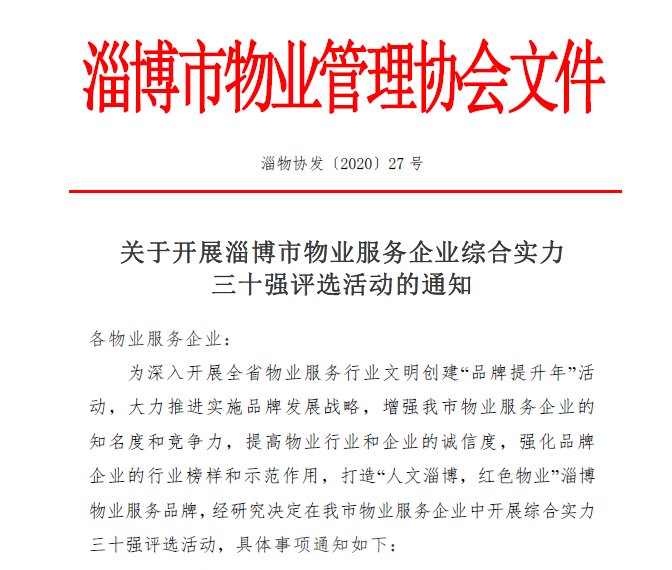 此次评选活动,是为深入开展山东省物业服务行业文明创建“品牌提升年”活动,大力推进实施品牌发展战略,增强淄博市物业服务企业的知名度和竞争力,提高物业行业和企业的诚信度,强化品牌企业的行业榜样和示范作用,而在该市物业服务企业中开展的综合实力三十强评选。旨在发现、选树一批具有行业影响力的企业,积极引导推动这些企业群体实施品牌化建设,培育形成特色鲜明的“人文淄博,红色物业”淄博物业服务品牌,促进全市物业服务向精细化、标准化、品牌化方向发展,以此带动提升淄博市物业行业整体发展水平。