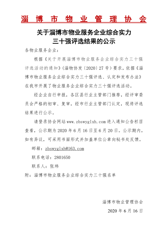 此前,淄博市物业管理协会下发了详细的《淄博市物业服务企业综合实力三十强评选、认定和发布办法》。办法中指出,本次活动以“诚信和承诺、公平、公正、公开、回避、保密和核查”为评选规则,确保评选的公信力和口碑。一经发现弄虚作假,则取消企业参评资格和奖项,并在行业内予以通报。
