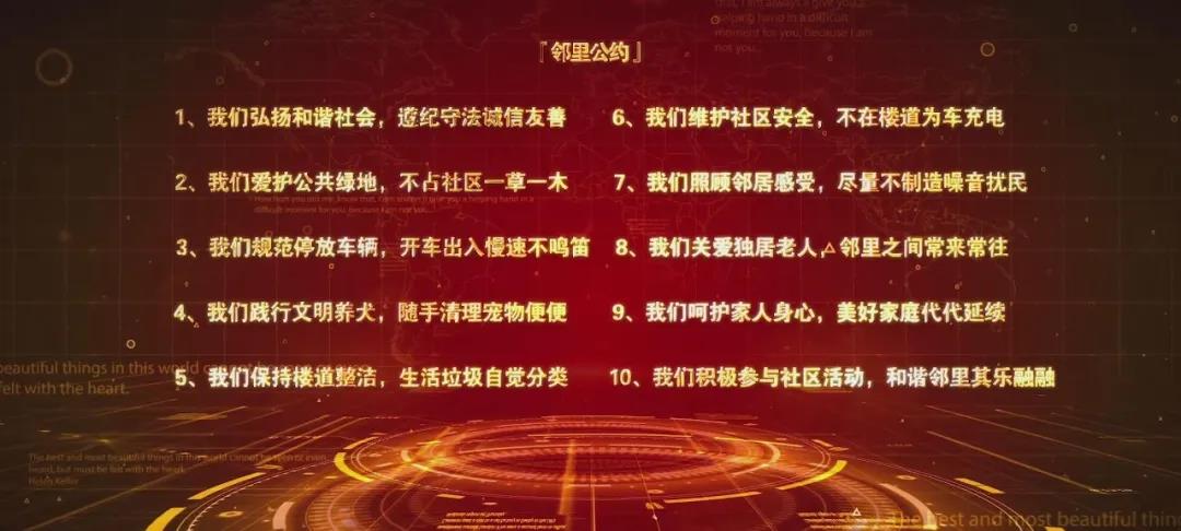 《邻里公约》是今年最美邻居评选活动的一项重要成果。内容涉及爱护绿地、规范停车、文明养犬、垃圾分类、噪音扰民、关爱老人等诸多大众关切的热点问题。在最美邻居颁奖典礼上,组委会对这一接地气的《邻里公约》进行了隆重发布,以倡议的形式号召大家遵守。