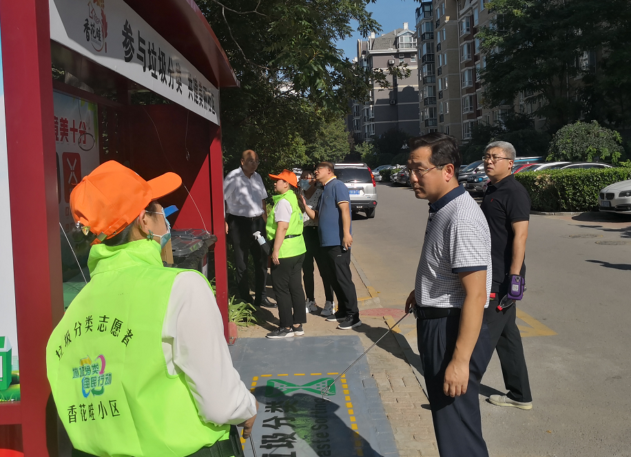 9月5日,后沙峪地区党委书记冯江全、地区党委副书记、镇长李强等政府领导莅临香花畦检查均豪物业垃圾分类工作。均豪物业工作人员为莅临检查的各位领导展示了垃圾分类的工作流程,包括:广播温馨提示、站内构造、开盖拉环、破袋装置、消毒喷雾等。