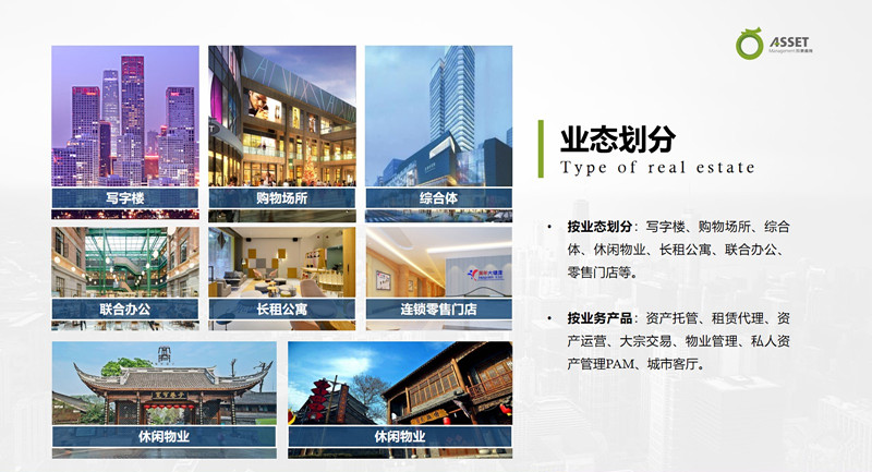 均豪商用资产管理以信守“为我们的客户所投资持有的不动产保值增值提供长期持续的保障,获得最大的投资回报,并使使用人获得超出满意度的专业管理服务。” 服务类型包括:商业综合体、写字楼、购物中心、联合办公、长租公寓、销售终端、商业文旅等。