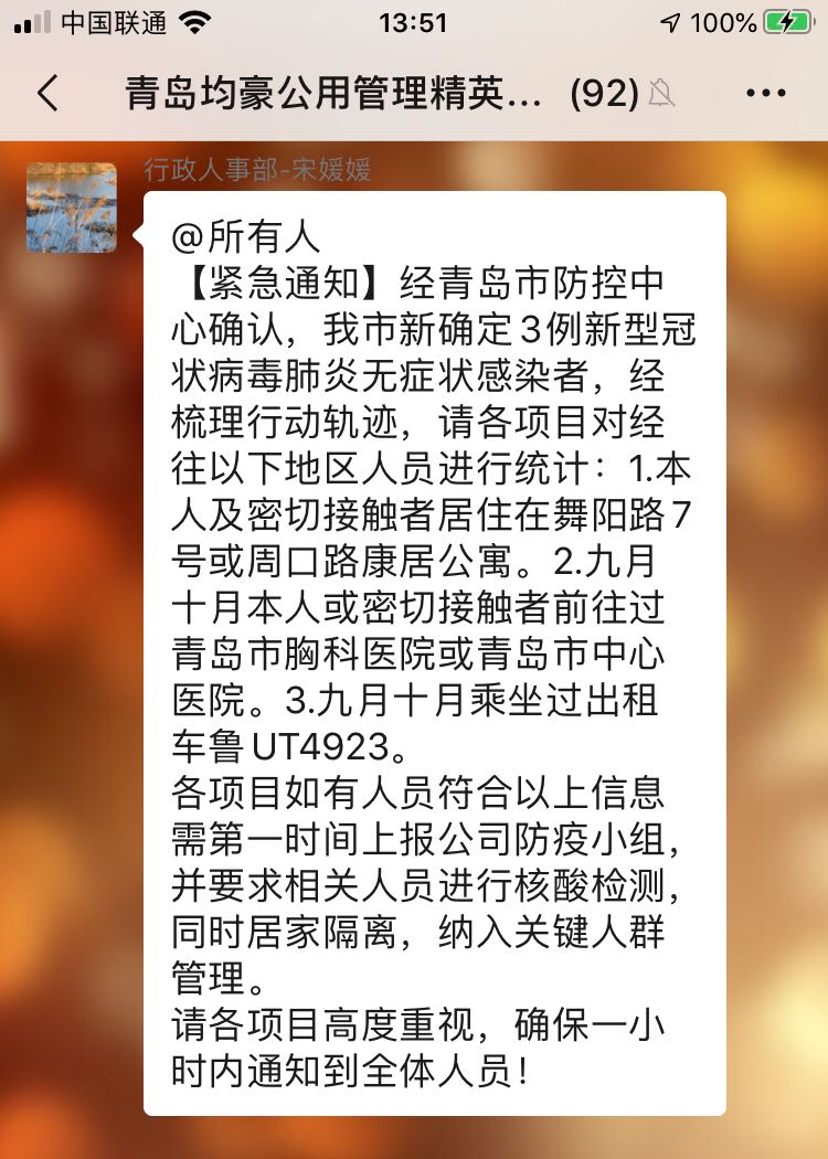 11日青岛疫情发生后,青岛公用、山东均豪公司立即启动应急响应机制,第一时间在公司工作群中发布紧急通知,要求在管项目在一小时内统计出所有员工的行动轨迹,对是否为密切接触者进行快速排查并形成文件进行反馈。